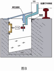 室外安全滑觸線地溝結構:垂直安裝圖A、側面安裝圖B、地溝活動蓋板,每0.5米/塊蓋合整個地溝,支架為基建時一次性建筑。