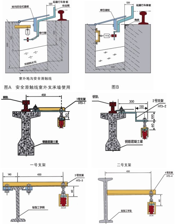 室外安全滑觸線地溝結構:垂直安裝圖A、側面安裝圖B、地溝活動蓋板,每0.5米/塊蓋合整個地溝,支架為基建時一次性建筑。